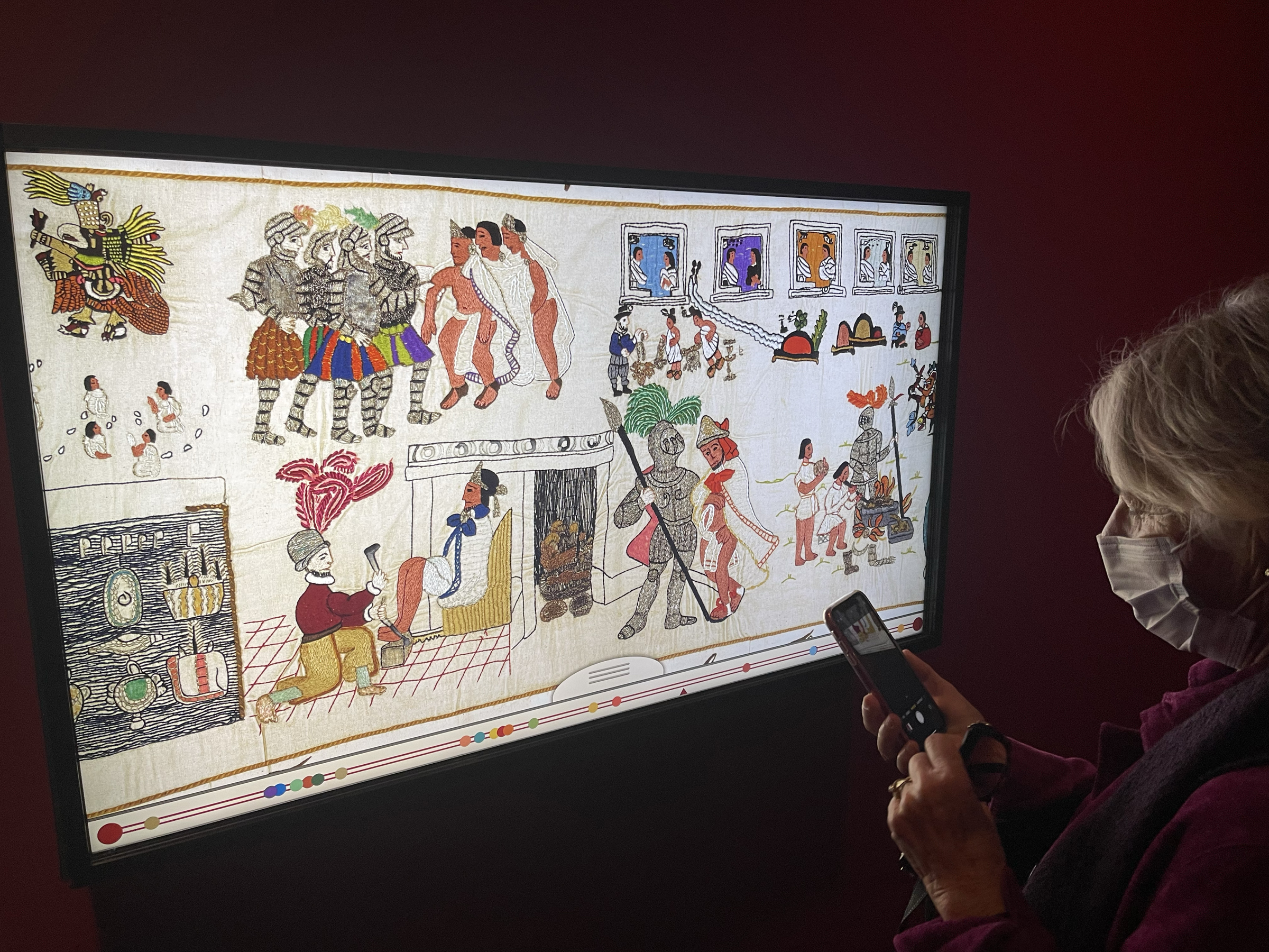 Explore this intricate tapestry illustrating the events of the Spanish Conquest nearly 500 years ago. Artist Leslie Tillett used pictorial records from the 1500s and 1600s—such as the Florentine and Azcatitlan Codices (book-form manuscripts), to inform the textile’s individual scenes. He then worked with a group of embroiderers to create this 100-foot-long tapestry, which includes depictions of Malinche’s role in the conflict.